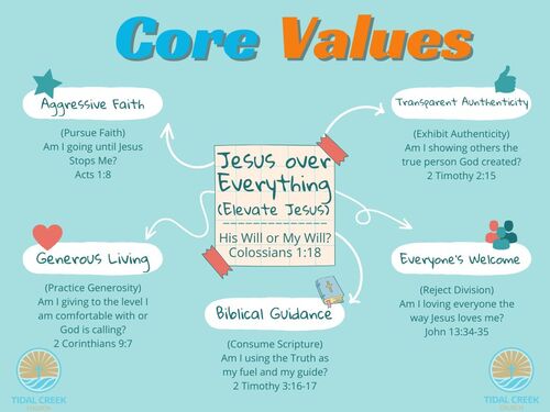 The Core Values of Tidal Creek Church represent how we believe that Jesus, through the work of the Holy Spirit transforms the life of the believe as we practice our faith in our everyday lives. Each one of the core values flows out of a radical vision to live as Jesus calls us to through His life, death, and resurrection by being a servant of all.